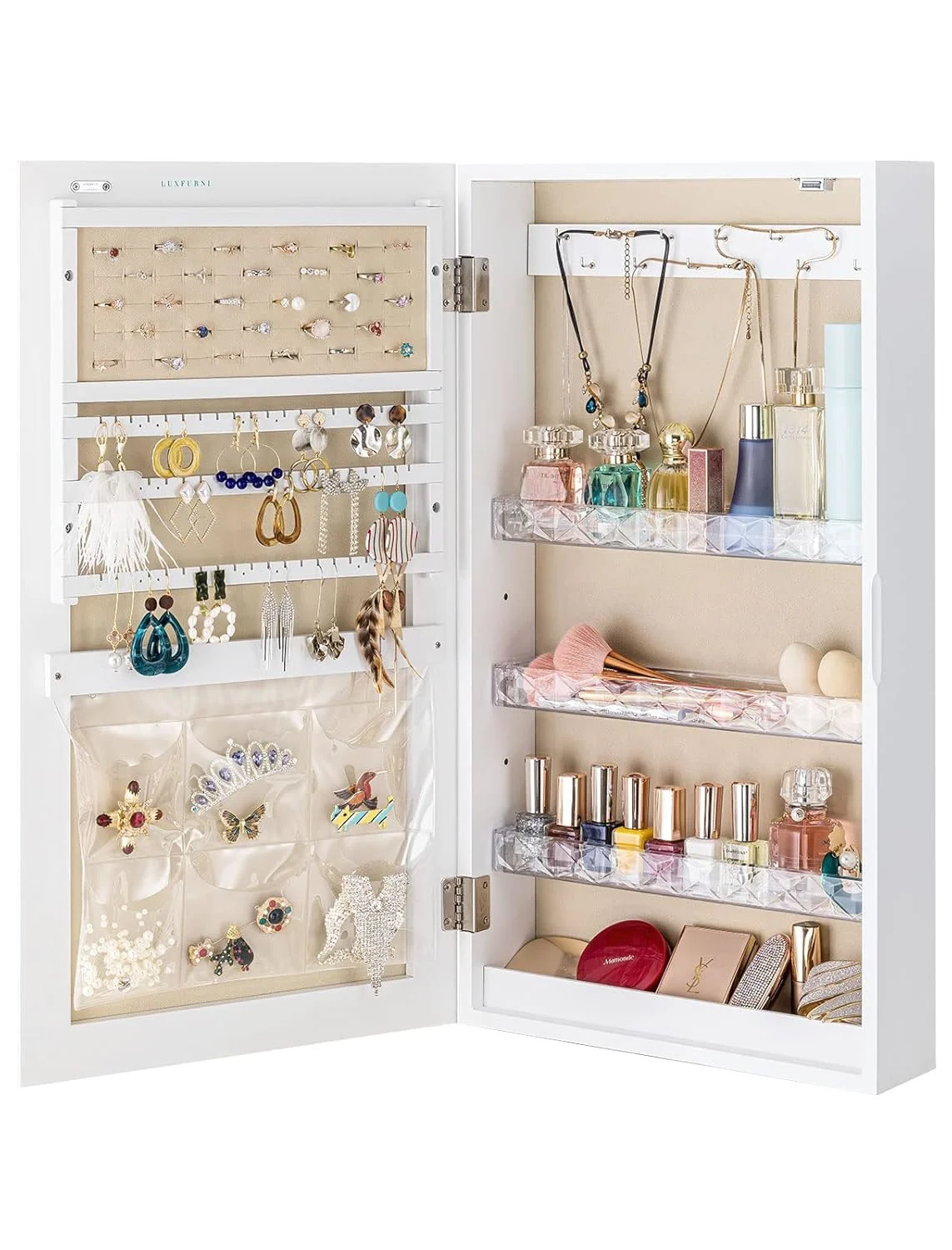 [𝐒𝐦𝐚𝐥𝐥 𝐉𝐞𝐰𝐞𝐥𝐫𝐲 𝐂𝐚𝐛𝐢𝐧𝐞𝐭] 26.4"H x 14.3"L x 4.2"D Revolutionary frame design occupies little wall space, but offers large storage capacity with 3 compartments, 6 storage bags, 48 ring holes, 60 earring slots, 18 stud holes, and 12 necklace hooks