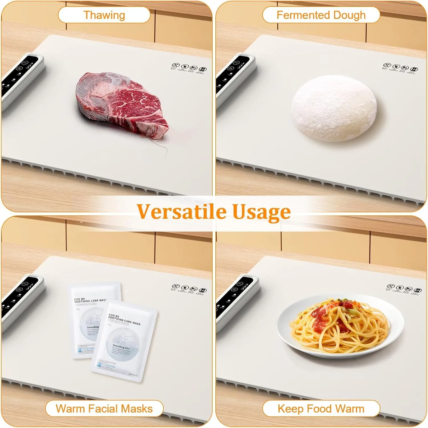 [Foldable Food Warmer] Revolutionary space-saving innovation with an ultra-thin thickness of 7MM. Measuring 23.9*14.9*0.3in, the food warmer features a smart foldable design that ensures easy storage, preserving your kitchen's precious space. With larger heating areas, you can simultaneously warm various dishes, catering to the family's diverse culinary desires.