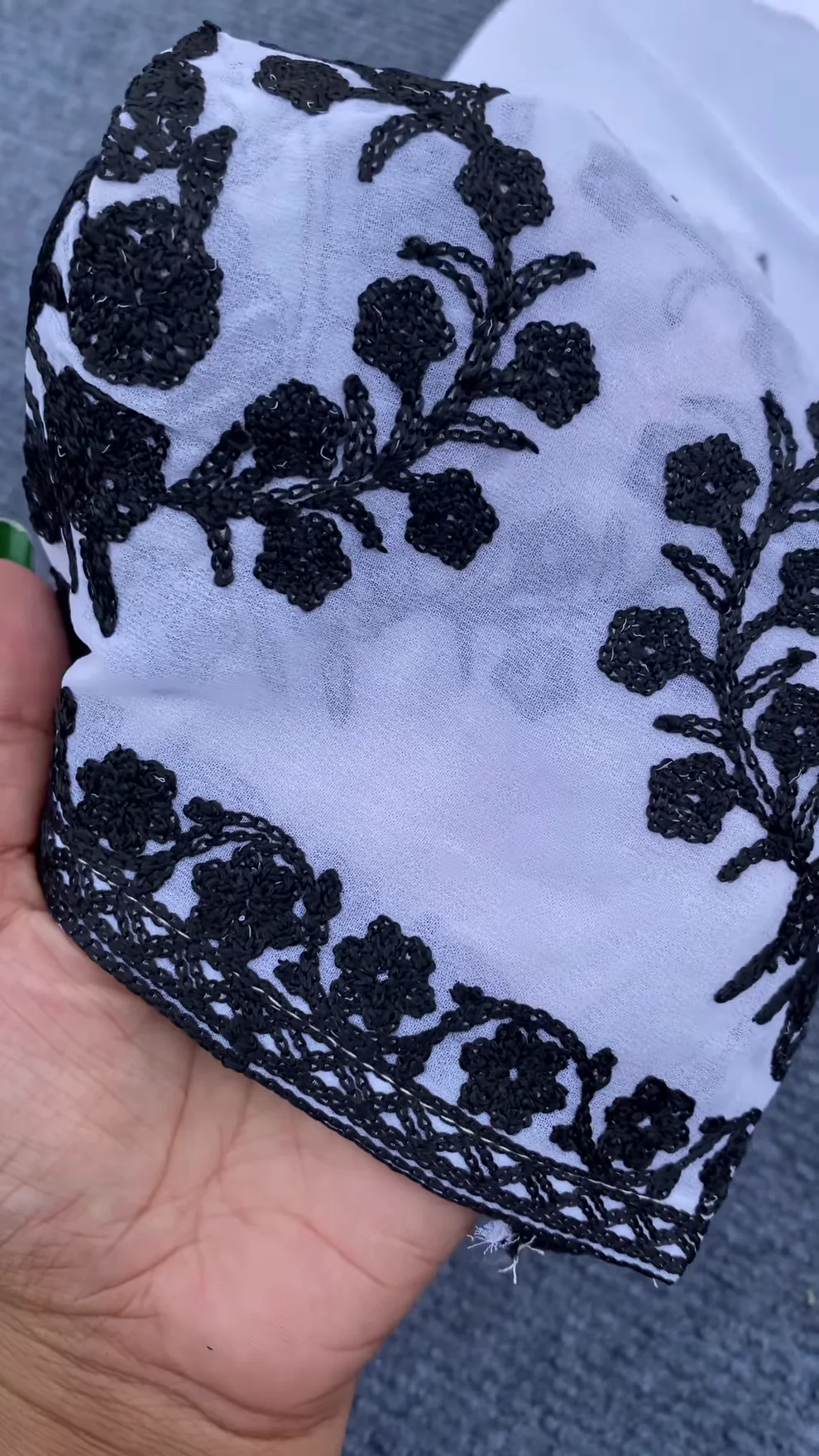 A lightweight white dupatta (scarf) is included, likely made from chiffon or a similar sheer fabric. The dupatta also features delicate black embroidered details, possibly scattered motifs or a border that complements the embroidery on the kurta. The sheer fabric of the dupatta adds an ethereal and graceful touch to the overall outfit.