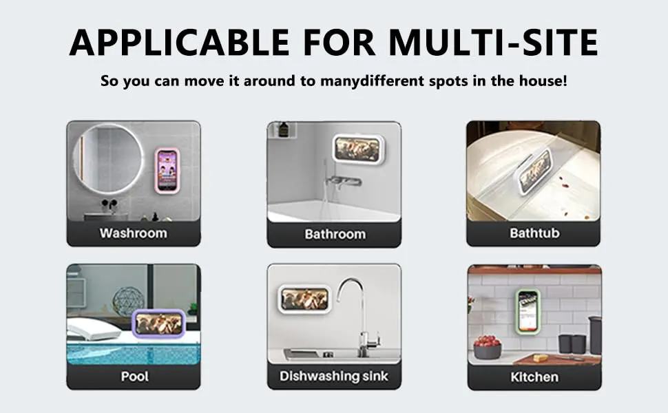 This waterproof mobile phone holder is designed to keep your smartphone safe, visible, and easy to use in wet or busy environments. Built with a fully sealed protective frame, it shields your phone from water splashes, steam, oil, and dust, making it perfect for bathrooms, kitchens, washrooms, bathtubs, poolsides, and other multi-site locations around the home. The transparent front cover supports smooth touch operation, so you can watch videos, follow recipes, attend calls, or scroll content without removing your phone from the case.