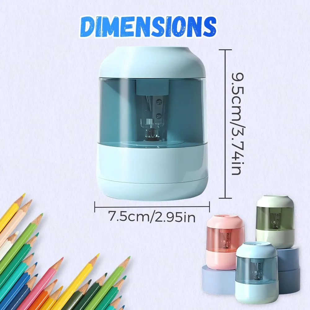 This compact electric pencil sharpener is designed to make everyday sharpening quick, clean, and effortless. With a modern cylindrical design and transparent body, it allows you to clearly see the sharpening process while adding a neat, aesthetic touch to your study or workspace. Its small footprint makes it easy to place on desks, shelves, or inside school bags, making it ideal for students, artists, and office use alike.